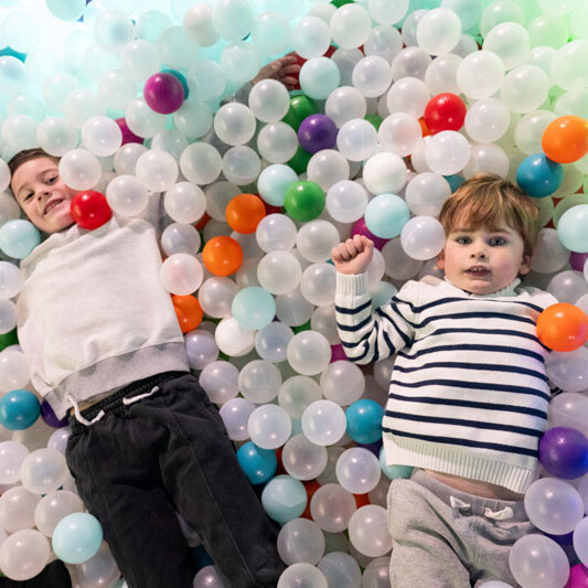 Leap into a giant, spotlessly maintained ball pit where kids can play amidst bright jungle colors and interactive projections on nearby walls that turn classic ball tosses into virtual challenges full of motion and fun.